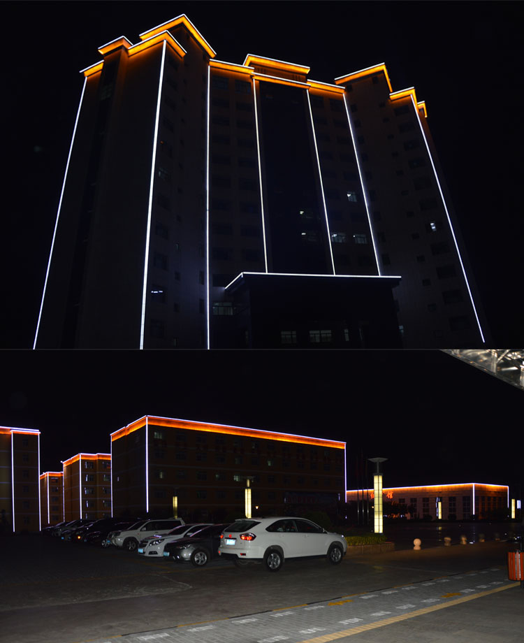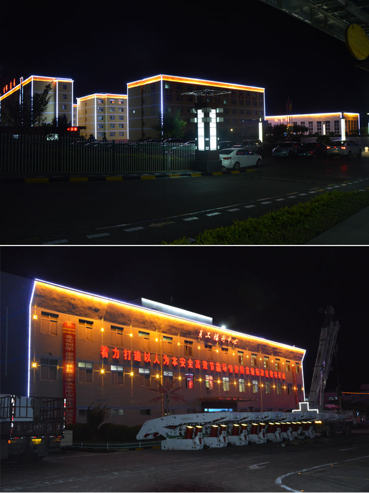銅川建新煤化是我公司承接的廠區(qū)亮化工程之一,該項(xiàng)目整體從設(shè)計(jì)到施工,全程有我公司承擔(dān)負(fù)責(zé),設(shè)計(jì)根據(jù)甲方的要求,采用簡潔明了的線條勾勒輪廓和打亮為主。在廠區(qū)主要的辦公樓、餐廳、員工活動中心、員工福利中心、員工宿舍樓等員工主要活動的場所樓進(jìn)行重點(diǎn)亮化。